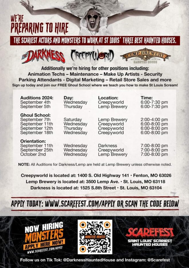 A haunted house in the St. Louis, MO area is gearing up for the most terrifying season yet, and they’re looking for the scariest actors and monsters to join the frightful fun at St. Louis’ premier haunted attractions: Darkness, Creepyworld, and Lemp Brewery.