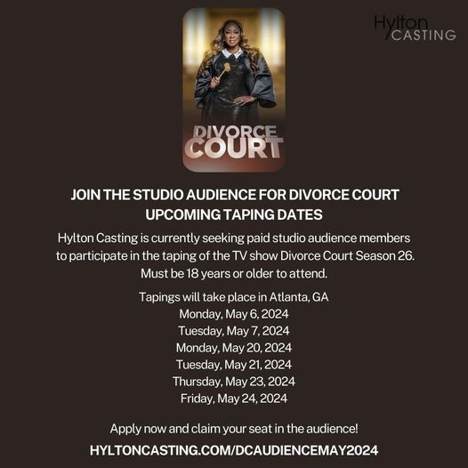 Casting directors with Hylton Casting invite Atlanta area locals to experience the courtroom dynamics as they record episodes of Divorce Court in Atlanta, GA from February to May 2024.
