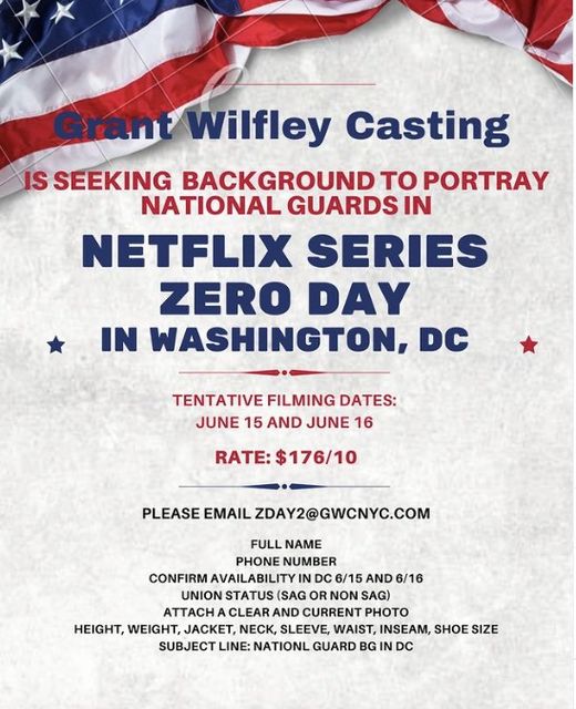 “Zero Day” is now in production in D.C., and extras casting directors at GWCI are holding a casting call to fill a bunch of background roles, including people to portray National Guard members.