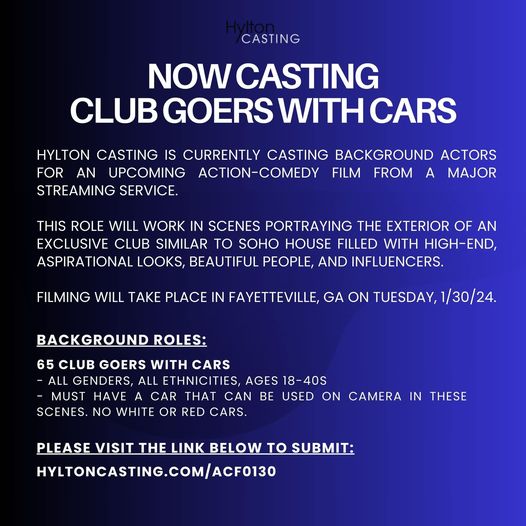 This role will work the exterior of an exclusive club similar to Soho House filled with high-end, aspirational looks and beautiful people. Filming will take place in Fayetteville, GA on Tuesday, 1/30/24.