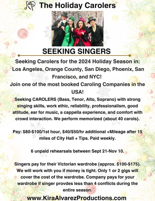 Seeking CAROLERS (Bass, Tenor, Alto, Soprano) with strong singing skills, work ethic, reliability, professionalism, good attitude, ear for music, a cappella experience, and comfort with crowd interaction. We perform memorized (about 40 carols).