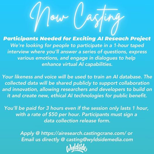 During the taped interview, you will be asked to answer a series of questions, express various emotions, and engage in conversations that will be used to train an AI database. Your likeness and voice will play a key role in shaping the future of AI, as the collected data will be made publicly available to support collaboration and innovation. This data will help researchers and developers create new, ethical AI technologies that benefit the public.