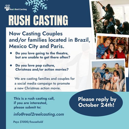 We are casting families and couples for a social media campaign to promote a new Christmas action movie.