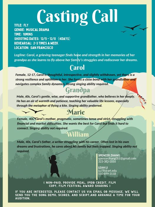 Please contact Spencer Zhang at spencerzhang001@gmail.com or 323-382-2016, or Leah Li at LI78@art.edu or 510-899-3118. Upon contact, we will provide the song demo, scores, and script, as well as schedule an audition time.