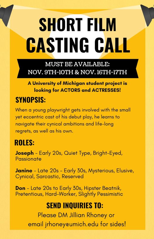 My name is Jillian Rhoney, I’m a senior film student at the University of Michigan and I am currently working on one of my final film projects! The story is an adaptation of a short story called “Wizard” by U of M alumni Michael Byers, about a young playwright getting involved with a small yet eccentric cast, navigating their cynical ambitions and life-long regrets, as well as his own. We are looking for some talent to bring this project to life, and can’t wait to here from some of you!
