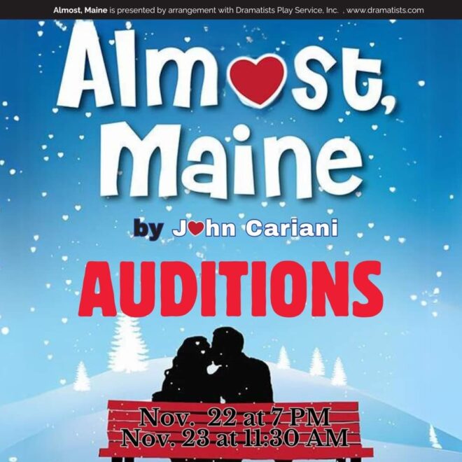 Almost, Maine invites you to a quirky northern town where love is in the air—almost! This charming play explores love in all its unexpected, humorous, and touching forms on a crisp winter night under the northern lights. Join us for auditions and become part of this delightful midwinter tale!