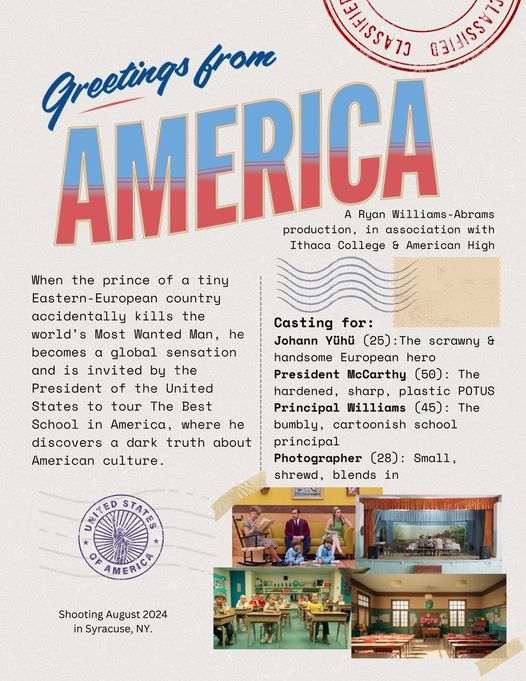 The Ithaca College student film, “Greetings From America,” is casting actors who can self-report to Syracuse, NY for a late August shoot at American High (Syracuse Studios).