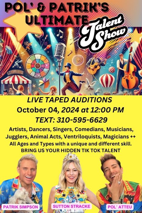 How to Apply: Text 310-595-6629 ASAP to reserve your spot for Friday, October 4th, 2024. Don’t miss your chance to share your talent with the world in the most creative, one-of-a-kind way possible!