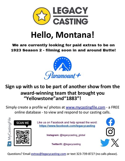 1923 Season 2: Is seeking more Native American Men to work with us 10/23. Filming is in DEER LODGE and fittings are in BUTTE, MT and required before filming to attend. Fittings are paid as well. Any Native American Men interested should email us at extras@legacycsting.com or text us at 323-739-8727. WE OF COURSE would love to book Non Native Americans as well for additional scenes!