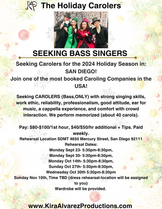 Join one of the most sought-after caroling companies in the U.S. for the 2024 holiday season! We are currently casting Bass singers with strong vocal skills to spread festive cheer throughout San Diego.