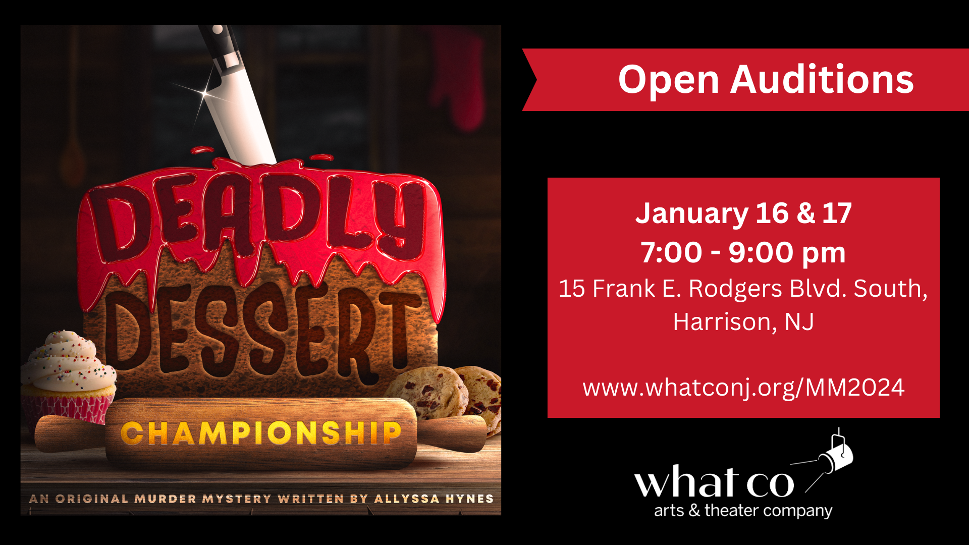 The theater invites aspiring actors to participate in open auditions for its annual dinner theater fundraiser, “Deadly Dessert Championship.”