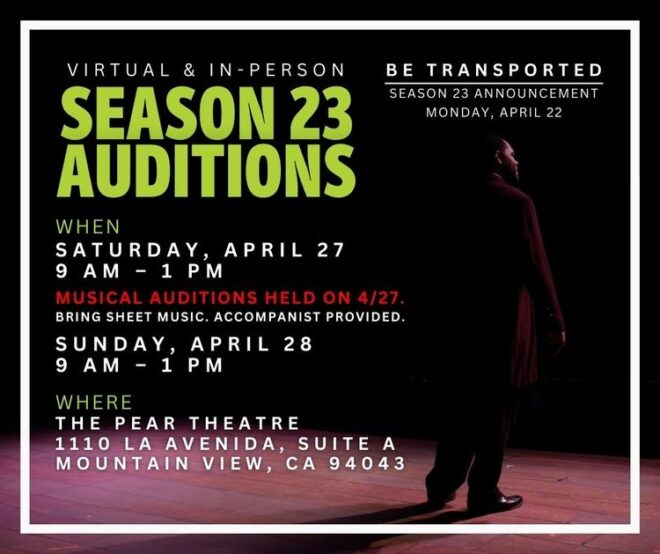 General auditions will be held on Saturday, April 27th from 9 am – 1 pm and Sunday, April 28th from 9 am – 1 pm and 6 – 9 pm at Pear Theatre, 1110 La Avenida, Suite A, Mountain View, CA.