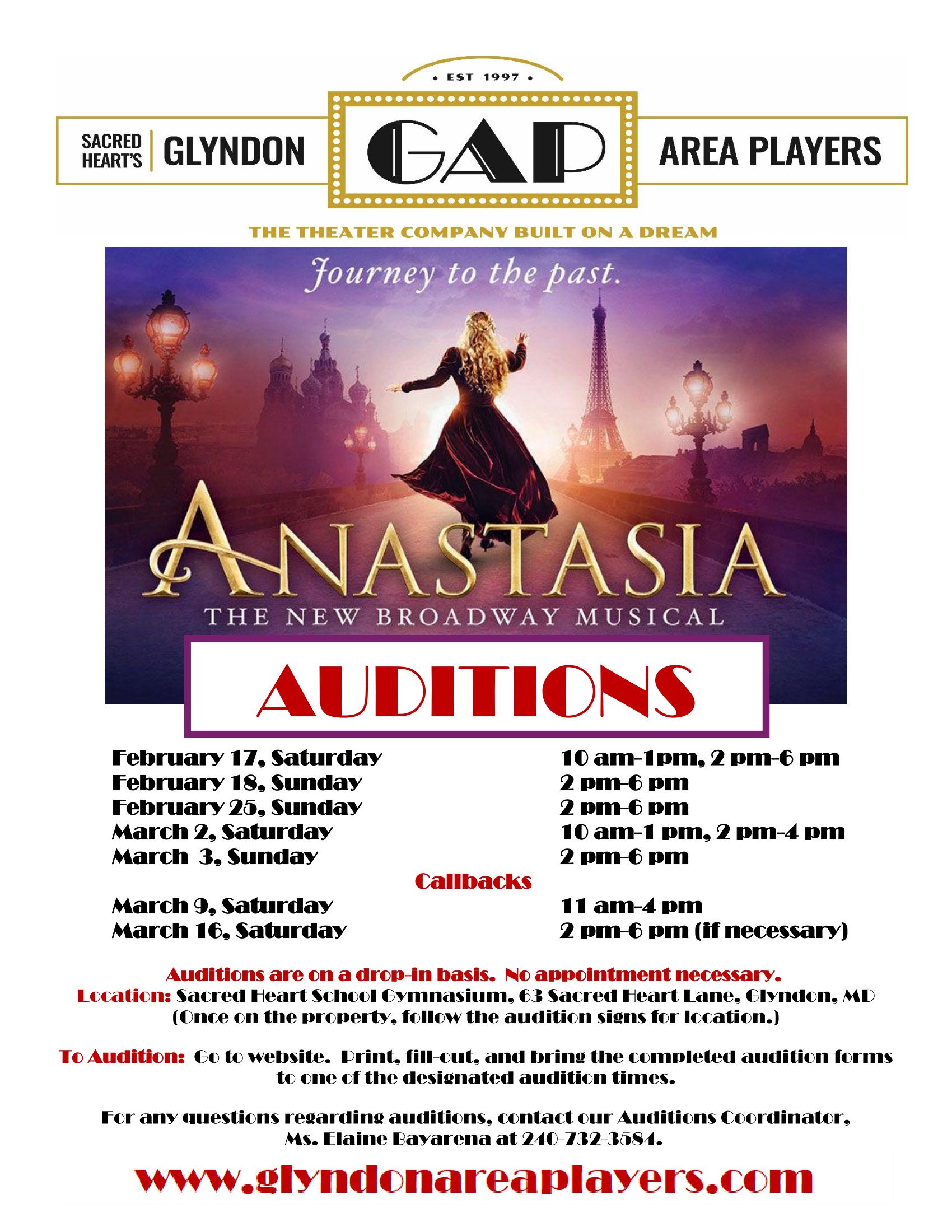 The Glyndon Area Players are casting our 27th annual production, Anastasia the Musical! All roles are open!