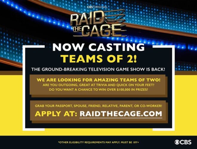 CBS’s prime-time game show, Raid The Cage, is seeking contestants for the new season of the game show. The online audition application form is open, and they have a casting call out for teams of 2.