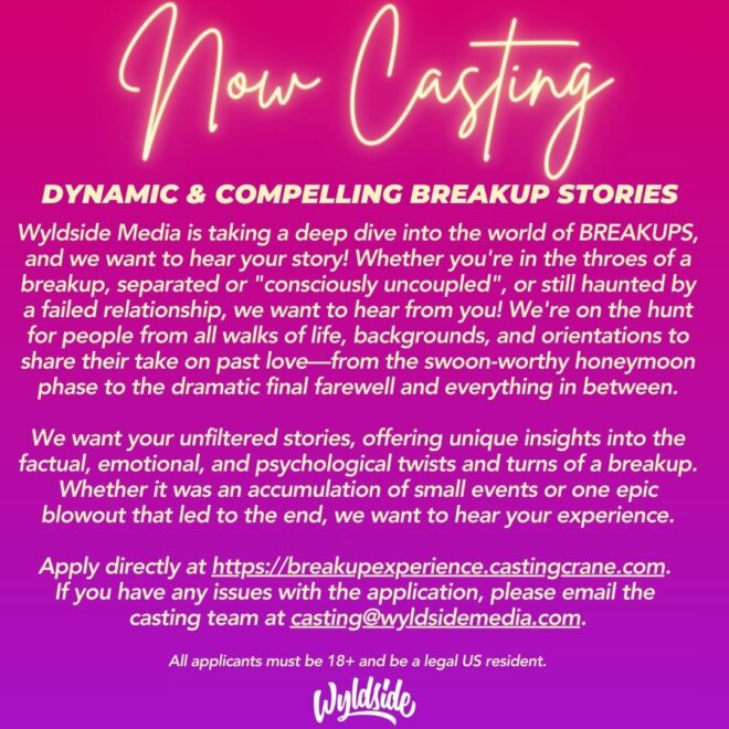 Wyldside Media invites individuals with captivating breakup stories to share their experiences for an upcoming project. Whether you’re currently navigating a breakup, in the process of separation, or reflecting on a past relationship, we want to hear your unique perspective.