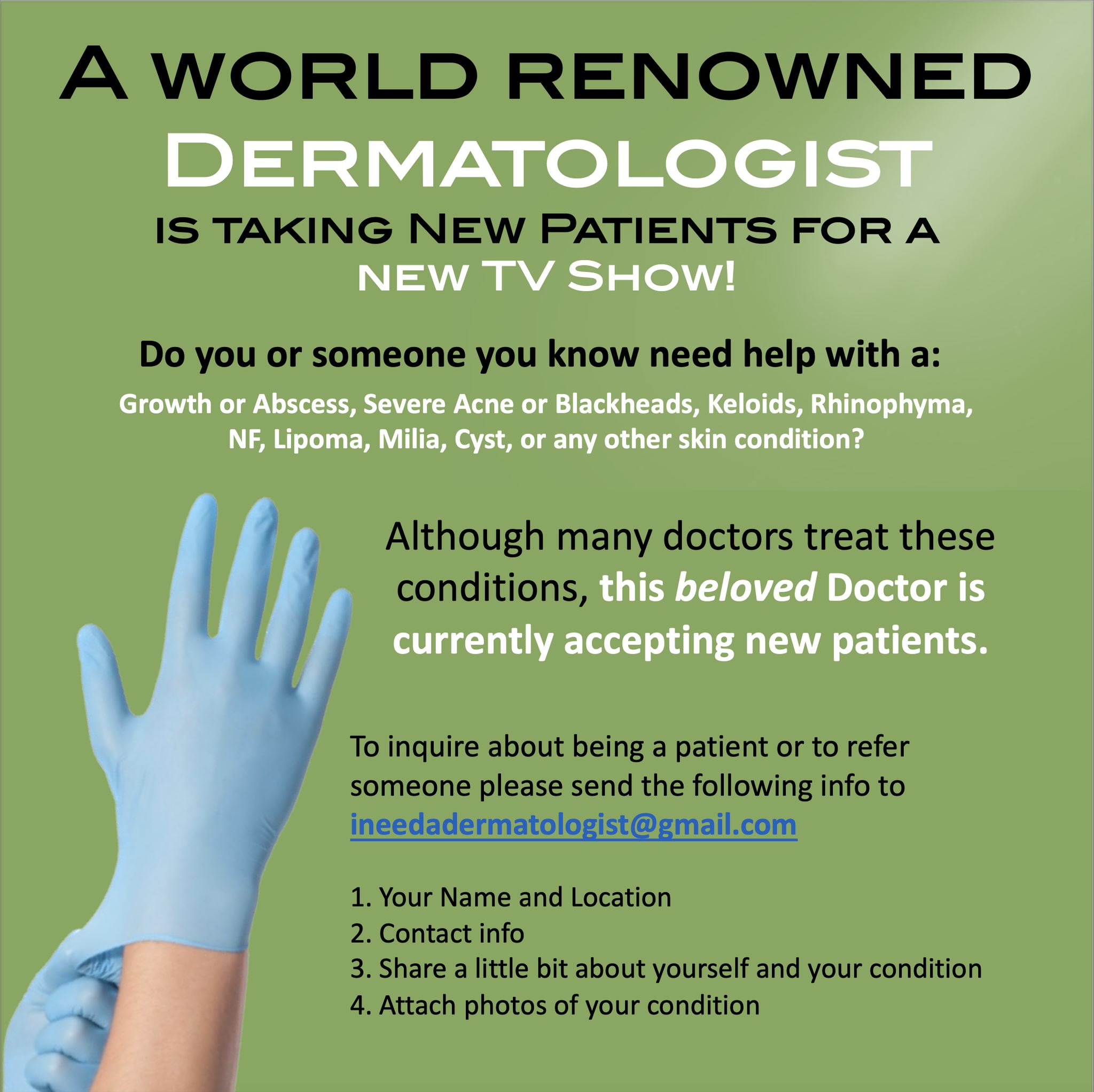 To inquire about being a patient or to refer someone please send the following info to ineedadermatologist@gmail.com