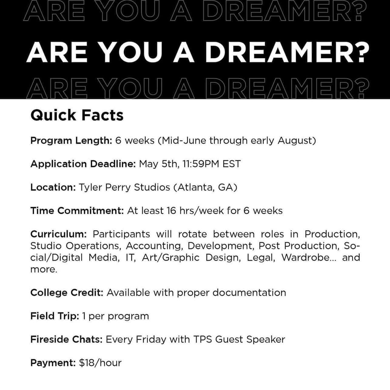 Those interested can check out the Tyler Perry Studios program at: https://dreamers.tylerperrystudios.com/