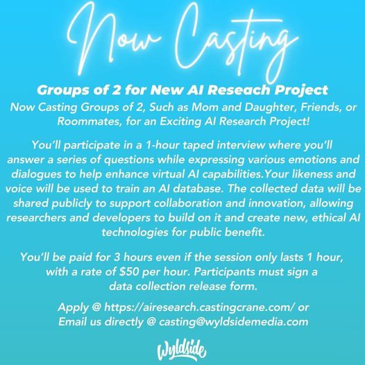 If you don’t mind your voice and likeness used in an AI project there is a casting notice out for a short, paid gig that needs participants who are good with their voices and likeness being used.