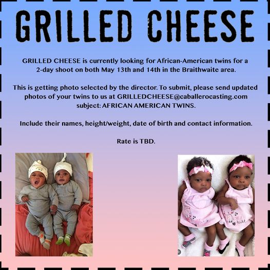 GRILLED CHEESE is currently looking for African American infant twins for a 2-day shoot in the Braithwaite area.