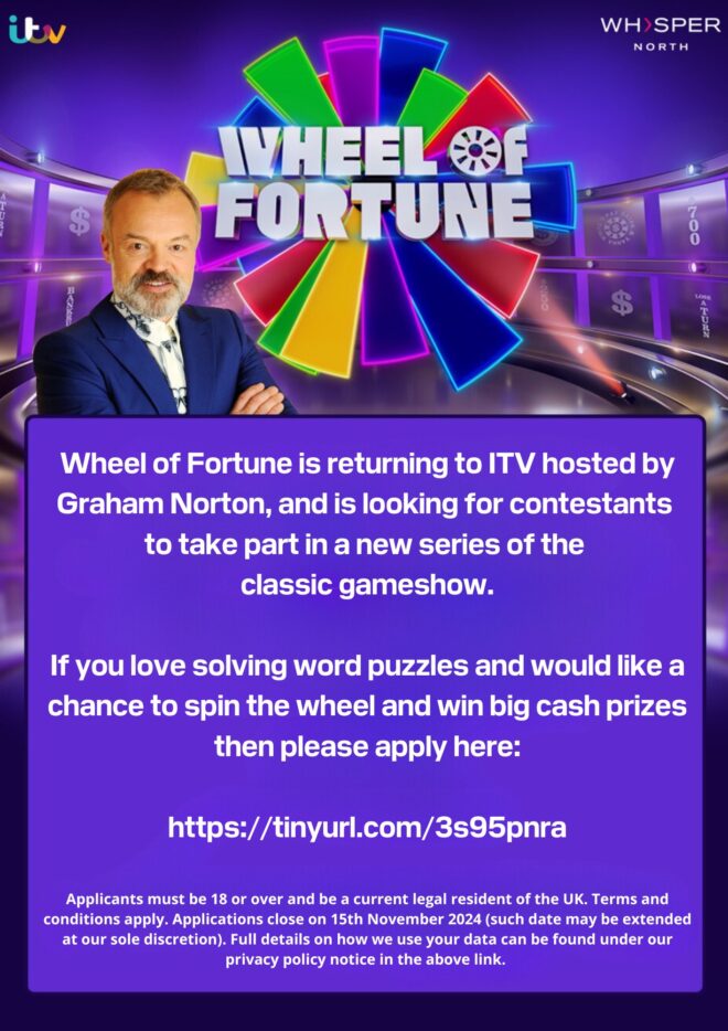 Exciting news! Wheel of Fortune is making a return to ITV, with none other than Graham Norton as the host. The classic gameshow is back, and they are looking for contestants to take part in this iconic game show. If you’re a fan of word puzzles and love the thrill of competition, this is your chance to spin the iconic wheel and win big cash prizes!