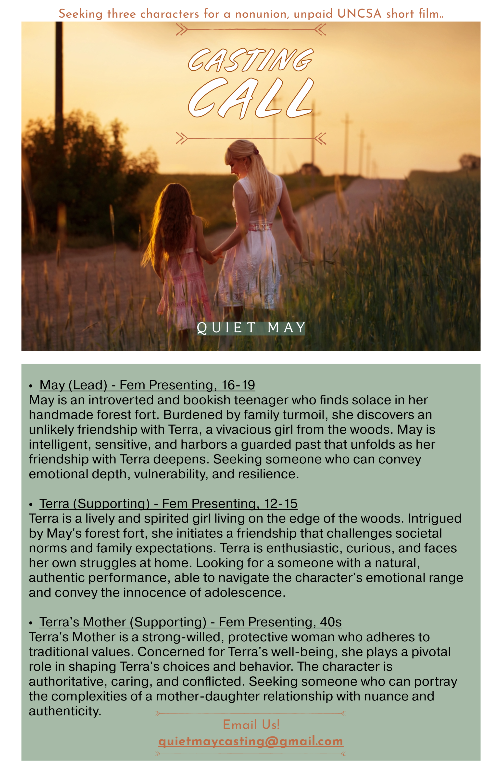 Please submit to: quietmaycasting@gmail.com by 03/18/2024 11:00 PM