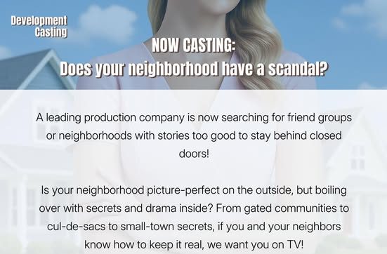 NOW CASTING NEIGHBORHOODS WITH SCANDALS! A leading production company is now searching for friend groups or neighborhoods with stories too good to stay behind closed doors! Is your neighborhood picture-perfect on the outside, but boiling over with secrets and drama inside? Development Casting – NOW CASTING: Does your neighborhood have a scandal? Is your neighborhood… Read More »