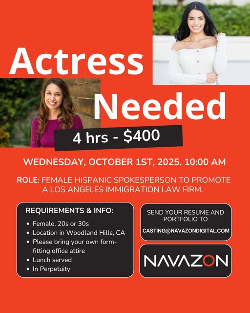 We’re looking for a non-union female Hispanic actress in her 20s or 30s to be the spokesperson for a social media video commercial for a Los Angeles immigration law firm.