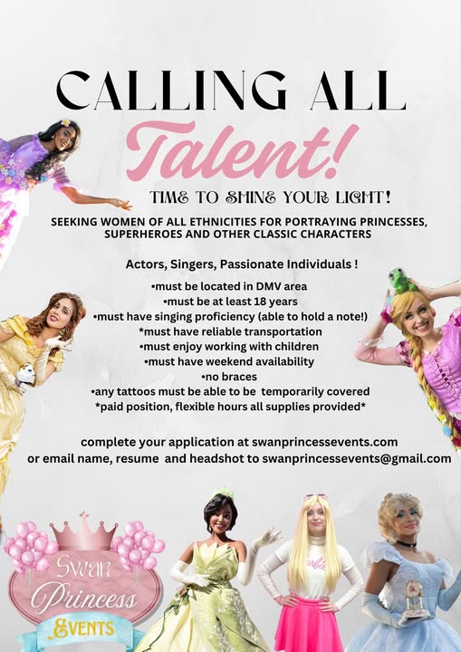Are you ready to bring magic to life? Swan Princess Events is seeking enthusiastic performers to portray beloved princesses, superheroes, and other iconic characters. If you have a passion for performance and love working with children, we want to hear from you!