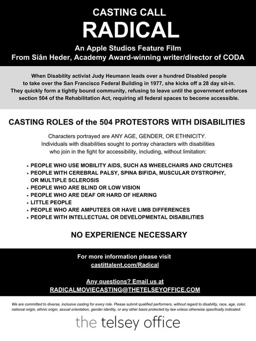 Seeking individuals with disabilities to authentically portray the 504 protestors. Roles are open to all ages, genders, and ethnicities. Specific disabilities include (but are not limited to):