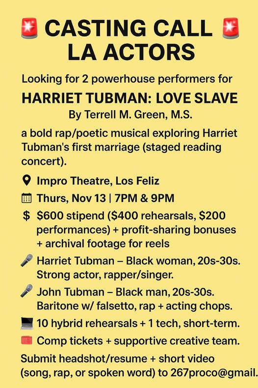 Playwright and composer Terrell M. Green, M.S. is bringing a bold new vision to the stage with a rap/poetic musical that dives into the rarely told story of Harriet Tubman’s first marriage. This staged reading concert will be presented at the Impro Theatre in Los Feliz on Thursday, November 13, with performances at 7 PM and 9 PM.