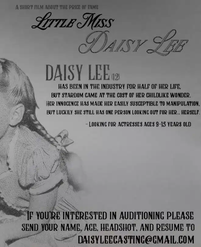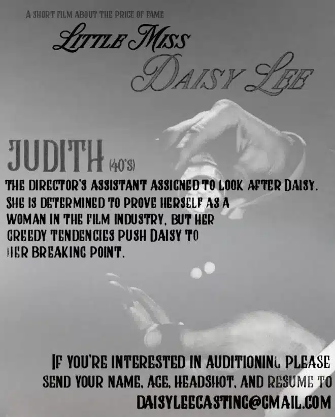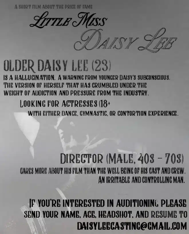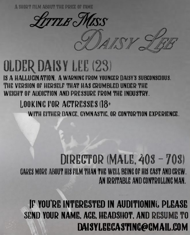 If you’re interested in auditioning please send your name, headshot, and age to: daisyleecasting@gmail.com