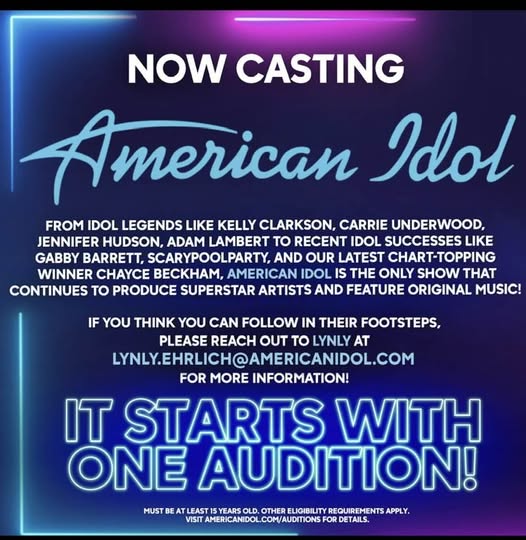 American Idol is back for a brand new season, and we are searching the country to find the best vocalist! Are you ready to take a chance? Sign up is easy – just email me at Lynly.ehrlich@americaidol.com and I will get you all set up! We are currently accepting submissions from folks ages 15-28. If that’s you, don’t wait!