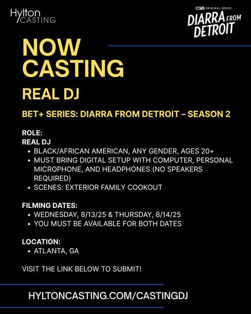 Producers of BET+’s hit Diarra from Detroit are seeking experienced DJs / REAL life DJ to work on a scene in the BET show “Diarra From Detroit” season 2. The TV show is currently filming in the Atlanta area and all applying must be local to Atlanta, Georgia.