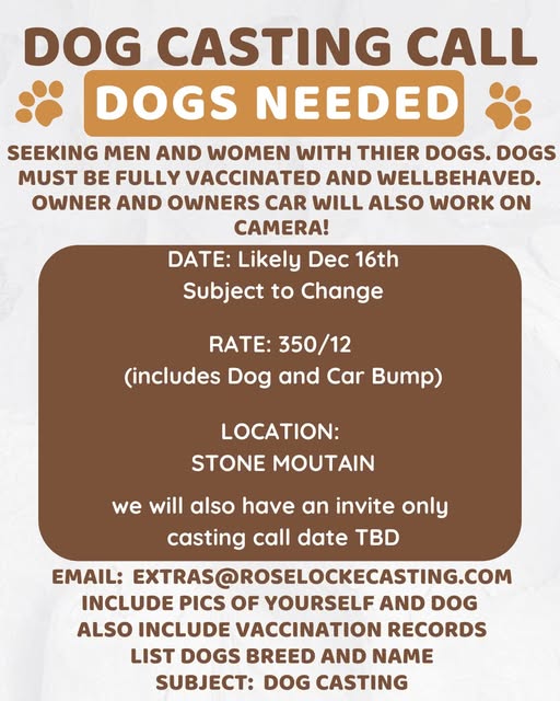 A dog-friendly casting call is out in Georgia. This productions is seeking men and women who can appear on camera with their well-behaved, fully vaccinated dogs. In addition to being featured on set, selected participants will also have their personal vehicles included in the shoot, as the owner, dog, and car will all be used on camera.