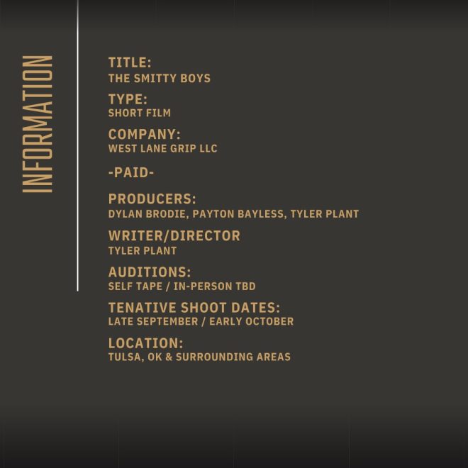 West Lane Grip LLC is now casting for The Smitty Boys, a paid short film project shooting in Tulsa, OK and surrounding areas. Travel expenses will be covered for non-local actors. Produced by Dylan Brodie, Payton Bayless, and Tyler Plant—who also serves as writer and director. The film is scheduled to shoot in late September to early October. Auditions will be accepted via self-tape, with in-person callbacks to be determined.