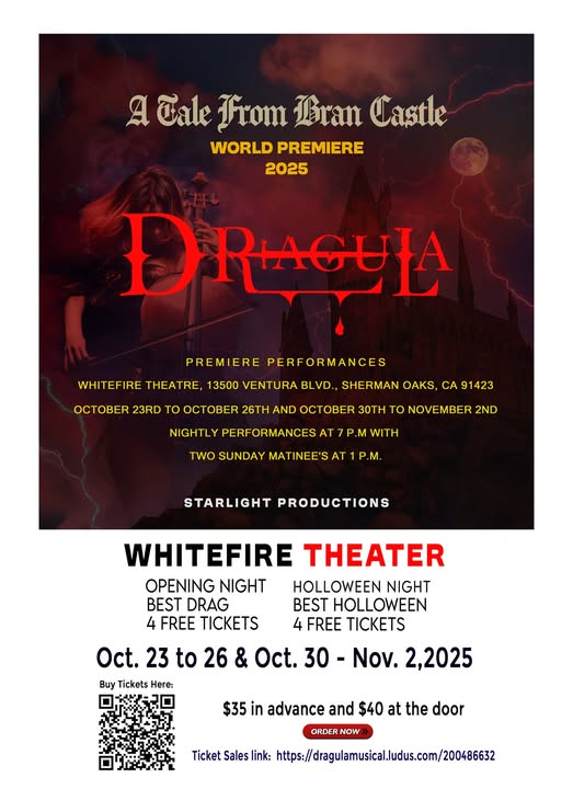 The show plays at the WhiteFire Theater on Ventura Blvd in Sherman Oaks October 23 to 26, and October 30 to November 2, 2025, at 7:30pm with a matinee on Saturday and Sunday at 2:30pm. We are paying $50.00/performance with a $80.00 bump at the closing of the show.