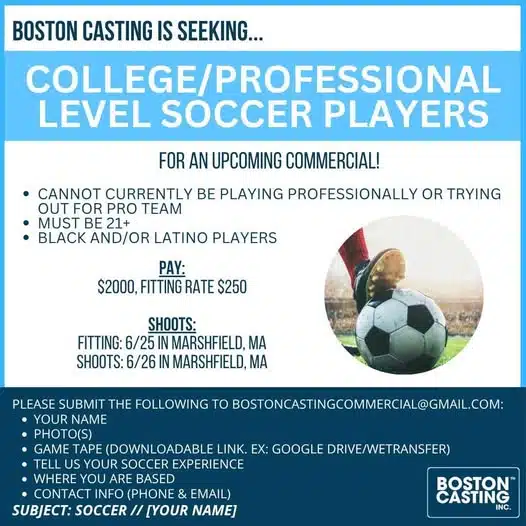 Boston Casting is now seeking Black and Latino soccer players, age 21 and older, for a new commercial shoot. Ideal candidates are former college or professional-level players who are no longer actively playing professionally or trying out for a pro team.