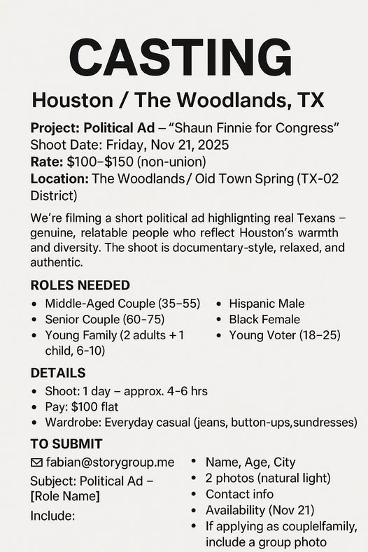 The production is seeking everyday Texans to appear in a short, documentary-style political ad. This seems to be for the TX-02 community. Filming will take place on Friday, November 21, 2025, in The Woodlands and Old Town Spring.