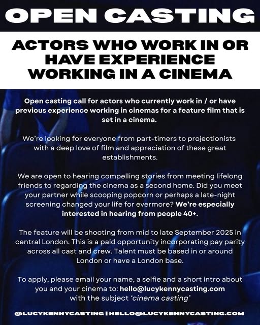 Send your name, a recent selfie, and a short introduction about your experience working in a cinema to hello@lucykennycasting.com with the subject line: cinema casting.