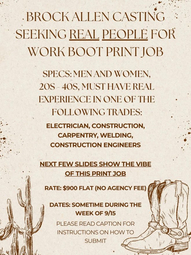 Brock Allen Casting is currently seeking real people for an upcoming work boot print project in Austin, Texas. The casting team is looking for men and women in their 20s to 40s with genuine experience in trades such as electrician work, construction, carpentry, welding, or construction engineering.