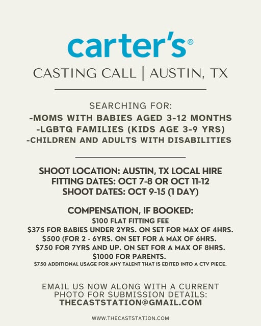 Carter’s, a leading name in children’s apparel, is casting families and individuals in Austin, TX for an upcoming campaign. The production team is looking to highlight real families and authentic connections, celebrating love and diversity in all its forms.