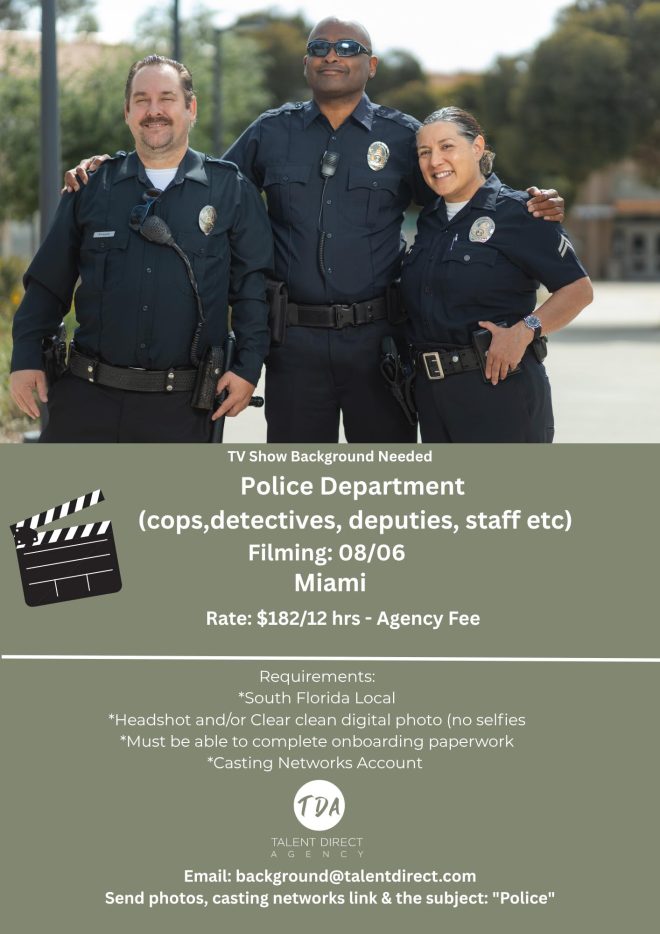 A television production filming in Miami, Florida is currently seeking background actors to portray various law enforcement roles, including cops, detectives, deputies, and department staff. This is a great opportunity for local talent to gain on-set experience and be featured in a professional TV production.