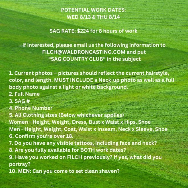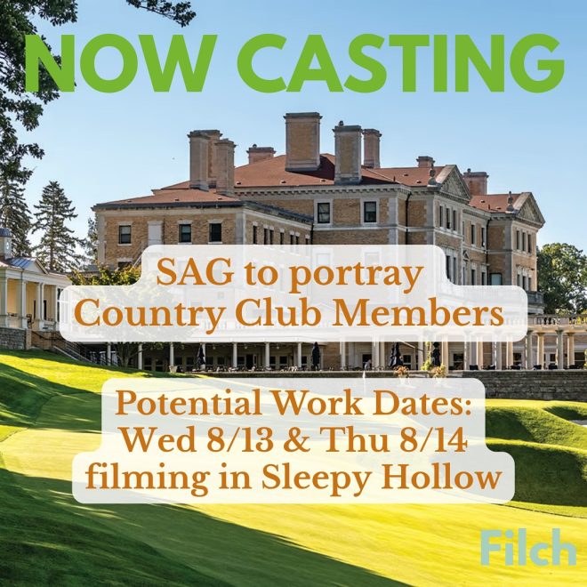 Waldron Casting is currently seeking background actors who live in or around the Sleepy Hollow area for an upcoming TV series “Filch” filming soon. This is a great opportunity for local residents to appear in some country club scenes.