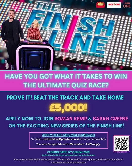 Hosted by Roman Kemp and Sarah Greene, The Finish Line combines quick thinking, general knowledge and fast-paced gameplay, offering contestants the chance to win up to £5,000. Producers are encouraging lively and fun individuals who love a challenge to apply now for their shot at TV quiz show fame.