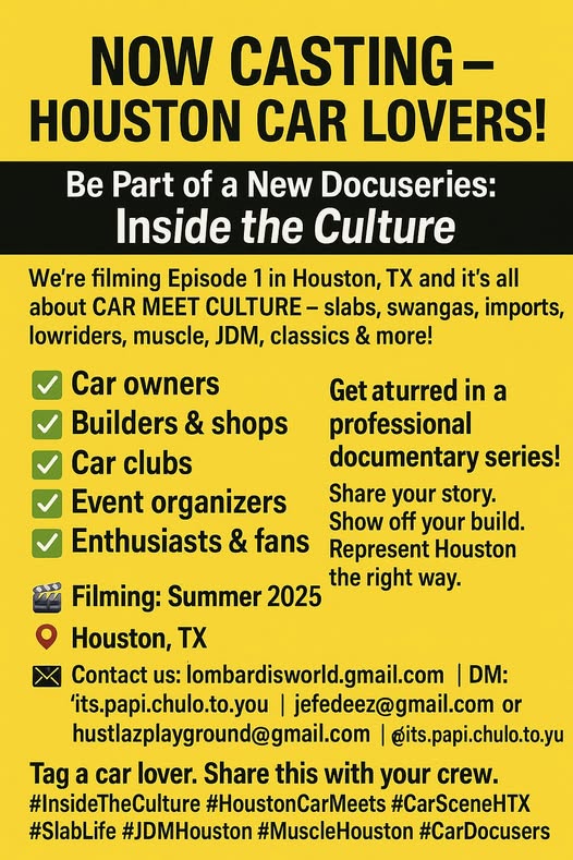 Producers are now casting Houston-area car lovers to appear in Episode 1 of a brand-new docuseries, Inside the Culture. The episode will explore Houston’s vibrant and diverse car meet scene, from slabs and swangas to imports, lowriders, muscle cars, JDM builds, and classics.