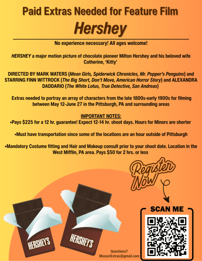 See: https://pghfilm.org/listing/hershey-pittsburgh-feature-film-background-casting/