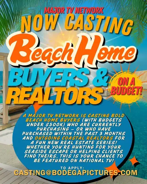 In addition, the casting team is also seeking coastal and beach realtors who have a vibrant personality and a knack for finding affordable beachfront deals. Realtors must be knowledgeable about their markets, camera-ready, and able to bring energy and expertise to the screen. Dynamic realtor-client duos are also encouraged to apply.