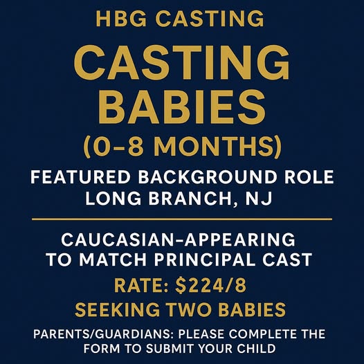 HBG Casting LLC is looking for two Caucasian-appearing babies, ages 0 – 8 months, to portray the baby version of a principal cast member in an upcoming project. This featured background role will film in Long Branch, New Jersey, on September 24 and or September 25. All roles are paid and the baby role pays the SAG-AFTRA rate of $224 for 8 hours.
