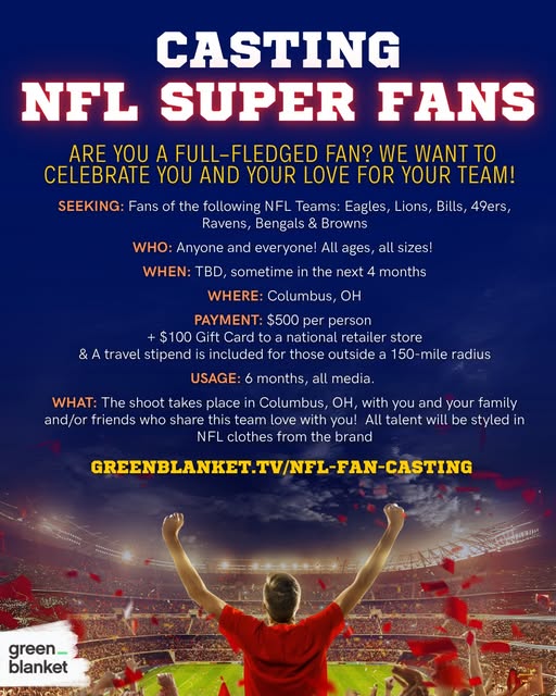 Producers are currently casting enthusiastic fans of the Philadelphia Eagles, Detroit Lions, Buffalo Bills, San Francisco 49ers, Baltimore Ravens, Cincinnati Bengals, and Cleveland Browns for a paid shoot in Columbus, Ohio. Whether you’re a lifelong supporter, a face-painting tailgater, or someone who has their living room decked out in team colors—this is your moment to shine.