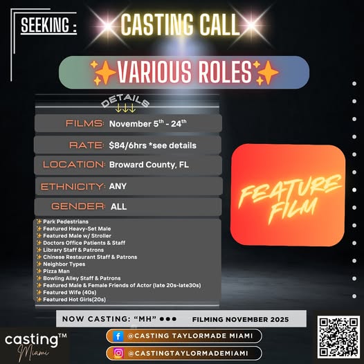 Casting TM is currently seeking talent for various adult roles in the upcoming independent film “MH.” Filming will take place from November 5 through November 24 in and around Hollywood and Fort Lauderdale, Florida, within Broward County. “MH” is an abreviation for the name of the film and not much other information is available on this production.